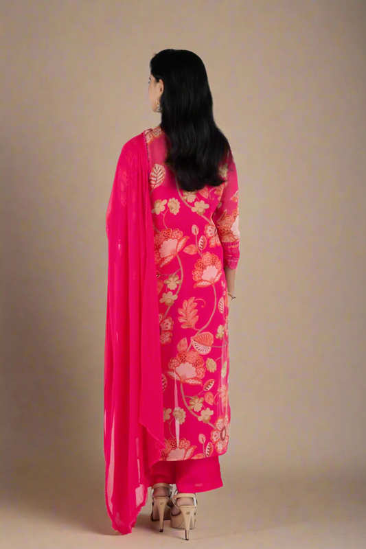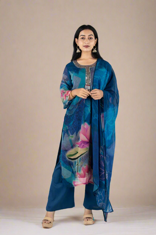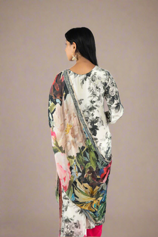Grey Floral Kurta Set with Chokar Dupatta and Palazzo